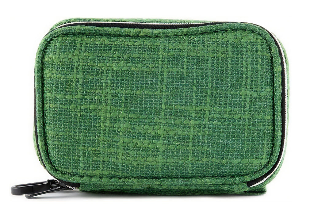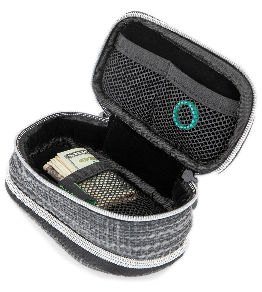 Exterior duradero de cáñamo o resistente al agua, interior de terciopelo acolchado resistente a las pelusas, cremalleras resistentes, clip de fácil fijación para mayor seguridad en viajes, bolsa de polietileno transparente a prueba de olores y etiqueta de velcro intercambiable para un estilo personal.